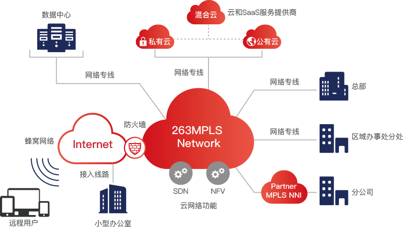 采用多协议标签交换( MPLS)技术、分段路由和EVPN技术等,为企业提供包含虚拟专网、企业专线、SD-WAN、混合云网络等服务的一整套解决方案。依托安全、可靠、稳定、开放的企业网络基础架构,263虚拟专网服务可帮助跨国企业实现全球组网,通过低延迟骨干网缩短企业关键办公应用的访问延迟,助企业打造具备全球互联网通信能力的云上网络。