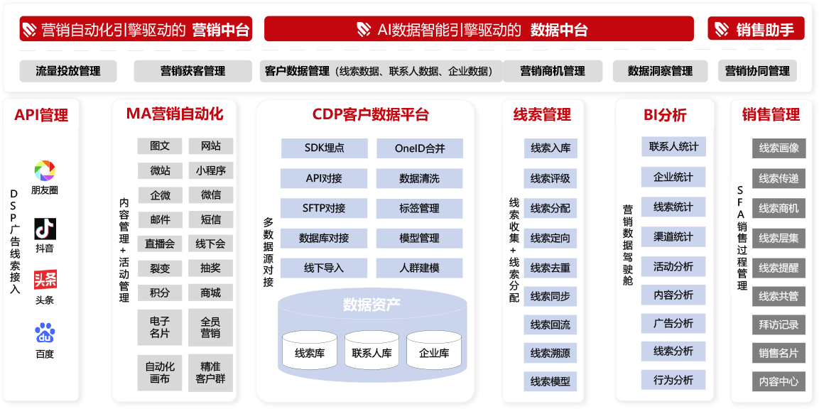 帮助企业完成量获取、用户心智占领,覆盖品牌曝光、舆情管理,最终实现线索转化的全链路数字营销方案。