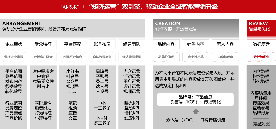 拥有全栈内容营销服务能力,为企业提供包括咨询规划、产品实施、运营陪跑一站式服务,辅助企业快速上手,提升营销ROI。